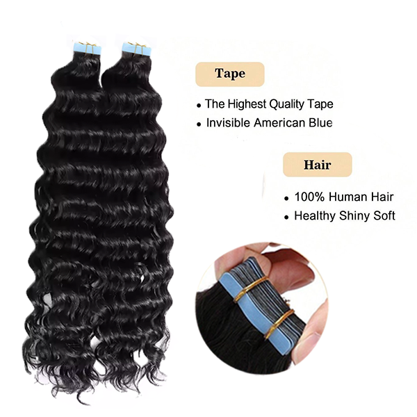 Deep Wave Seamless Tape in Natural Black Hair Extensions 100% Real Human Hair